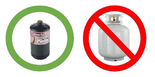 LP-gas container with a water capacity not greater than 2 1/2 pound: LP-gas containers that are labeled as “16oz 453 g (1LB)”. These are the small canisters that are commonly seen on camping grills and other small portable devices. The use of these grills still need to be located away from combustible items.