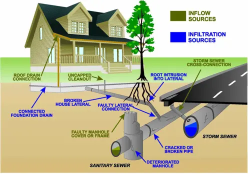 Sanitary sewers are designed to carry sewage and are not sized to handle added flows from inflow and infiltration. Inflow and infiltration are terms used to describe how groundwater and rainwater enter the sanitary sewer system. These sources are known as “clear water” to distinguish it from sewage.